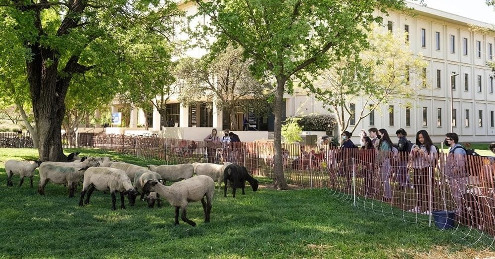 California, Estados Unidos | Todo El Campo | Las bicicletas pasan zumbando, los estudiantes corren a clase, el personal y la facultad almuerzan o toman café sobre la marcha, y las ovejas pastan en los montículos cubiertos de hierba entre el tráfico, balando de vez en cuando. El pastoreo es su trabajo.