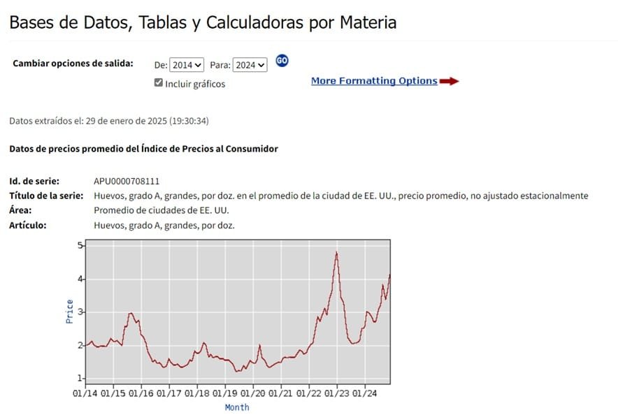 Los precios están cerca de máximos históricos en los mercados de Estados Unidos, pero ligeramente inferior al récord de 4,82 dólares alcanzado en enero de 2023, como se ve en la gráfica de la Oficina de Estadísticas Laborales.
