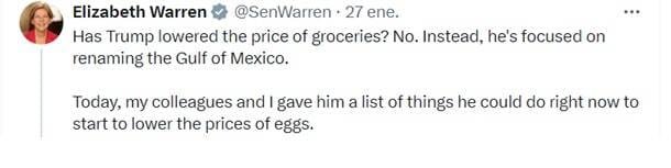 Además, la senadora Elizabeth Warren (demócrata), una de las firmantes de la carta, escribió en X: “¿Ha bajado Trump el precio de los alimentos? No. En cambio, se ha centrado en cambiar el nombre del Golfo de México”; y agregó: “Hoy, mis colegas y yo le dimos una lista de cosas que podría hacer ahora mismo para empezar a bajar los precios de los huevos”.