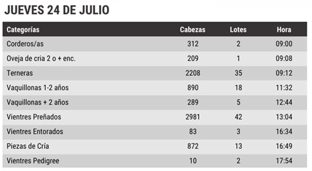La oferta es de corderos y corderas, ovejas de cría, vaquillonas de 1 a 2 años, vaquillonas de más de 2 años, los vientres preñados, los vientres entorados, las piezas de cría y los vientres pedigrí.