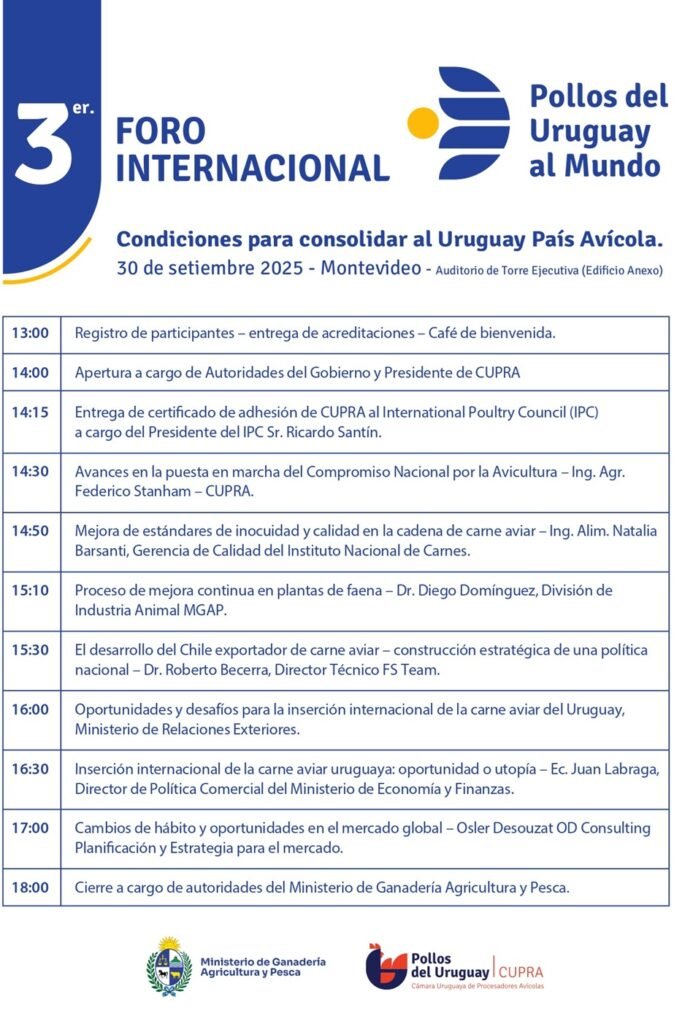 El martes 30 de setiembre, desde las 13.00 horas, en el auditorio de la Torre Ejecutiva (edificio anexo), se realizará el 3° Foro Internacional denominado “Condiciones para consolidar al Uruguay País Avícola”.