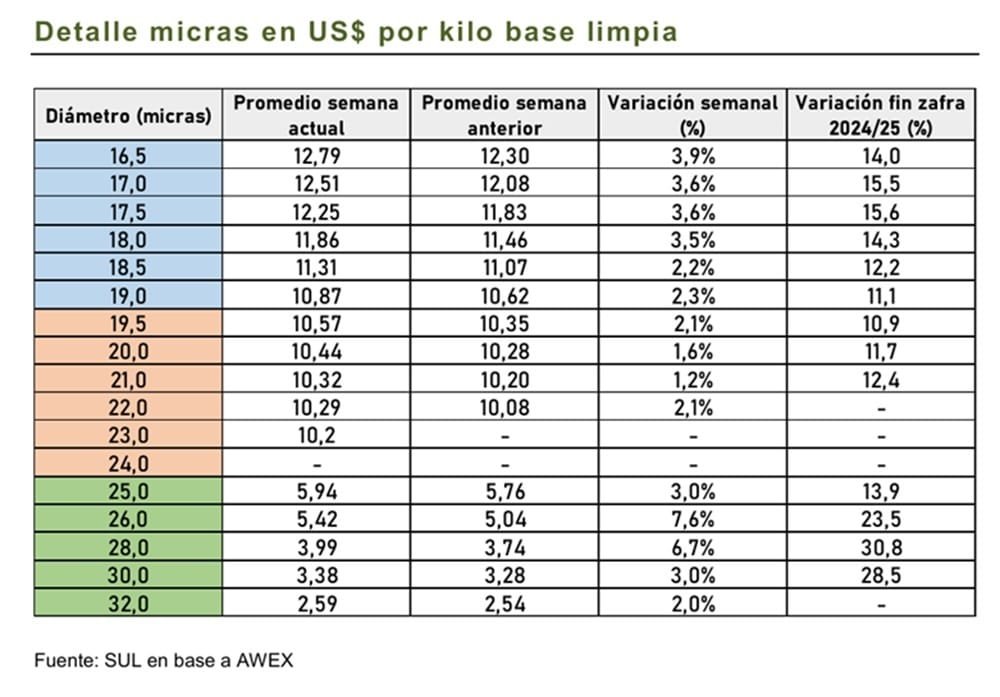 Por otro lado, los lotes Merino de más de 18 micras mostraron incrementos más moderados, con aumentos de entre el 1,2% y el 2,3%.