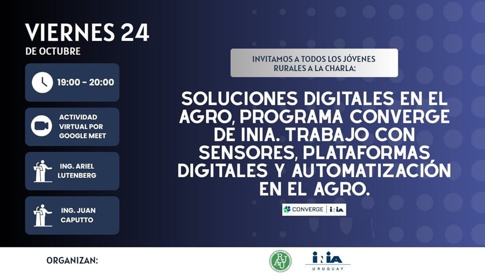 Montevideo | Todo El Campo | Este viernes 24 de octubre, el Instituto Nacional de Investigación Agropecuaria (INIA) y la Asociación Rural de Jóvenes del Uruguay (ARJU) realizarán la actividad sobre soluciones digitales en el agro, programa Converge de INIA, trabajo con sensores, plataformas digitales y automatización en el agro.