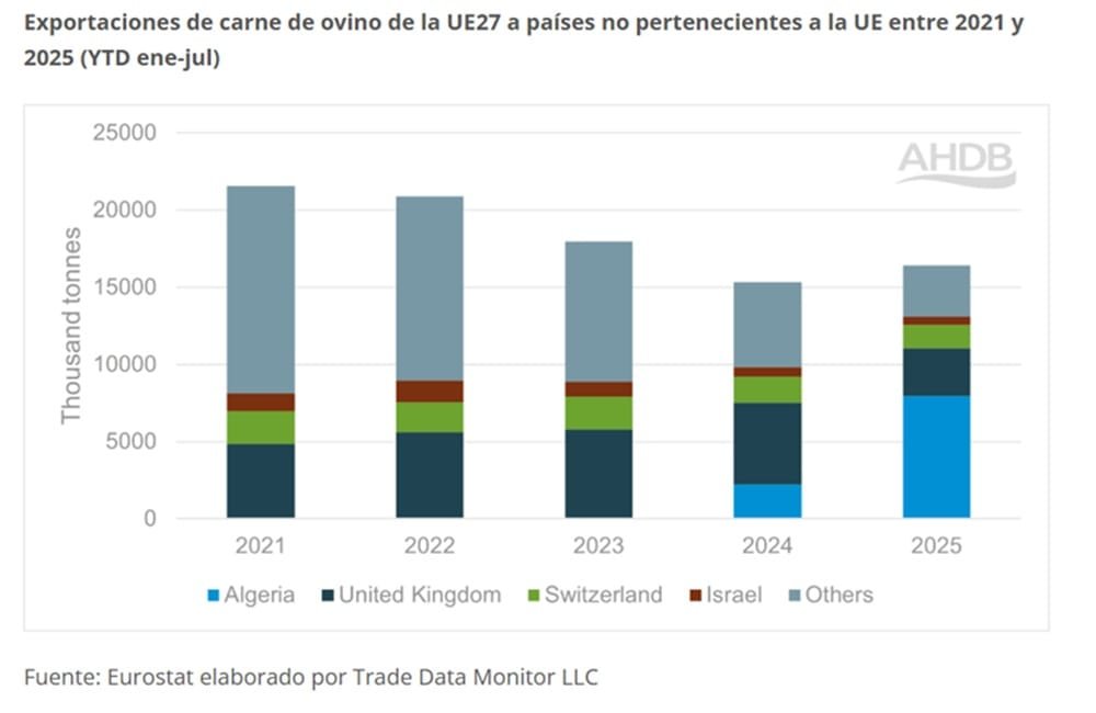 En las exportaciones de carne de ovino de la UE, el total es de 16.400 toneladas, un aumento anual de 1.100 toneladas (7%). Por país, Argelia es el mayor destino de las exportaciones de la UE, con un aumento significativo de los envíos desde 2024. El incremento de compras argelinas se debe a factores climáticos: “El calor extremo y a las precipitaciones por debajo del promedio dentro de las regiones productoras de ovejas del país, limita la producción nacional. Esto ha significado que las importaciones han aumentado para satisfacer la demanda, especialmente durante festivales religiosos como Eid”. Las exportaciones desde la UE a Reino Unido “cayeron en 2.200 toneladas para un total de 3.100 toneladas, una disminución del 41%, una demanda interna más débil de cordero en Gran Bretaña, combinada con una menor disponibilidad de productos en la UE, probablemente haya impulsado esta tendencia”, expresa el informe de AHDB.