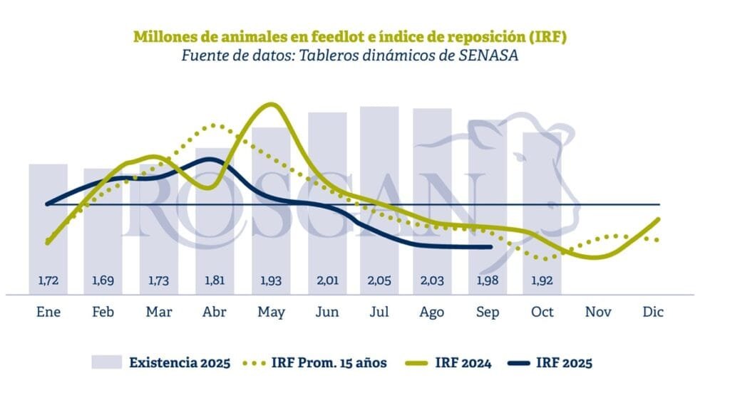 Al 1° de octubre, los datos informados por Senasa (Servicio de Sanidad y Calidad Agroalimentaria Argentina) confirman existencias por un total de 1.915.612 vacunos, un 3% menos que lo reportado el mes pasado, siendo este el tercer mes consecutivo en fase de vaciado. En concreto, durante el último mes, los corrales recibieron un total de 337.100 vacunos, al tiempo que registraron egresos por 442.442 animales, lo que refleja un Índice de Reposición de 0,76, un cociente muy similar al registrado en agosto.
