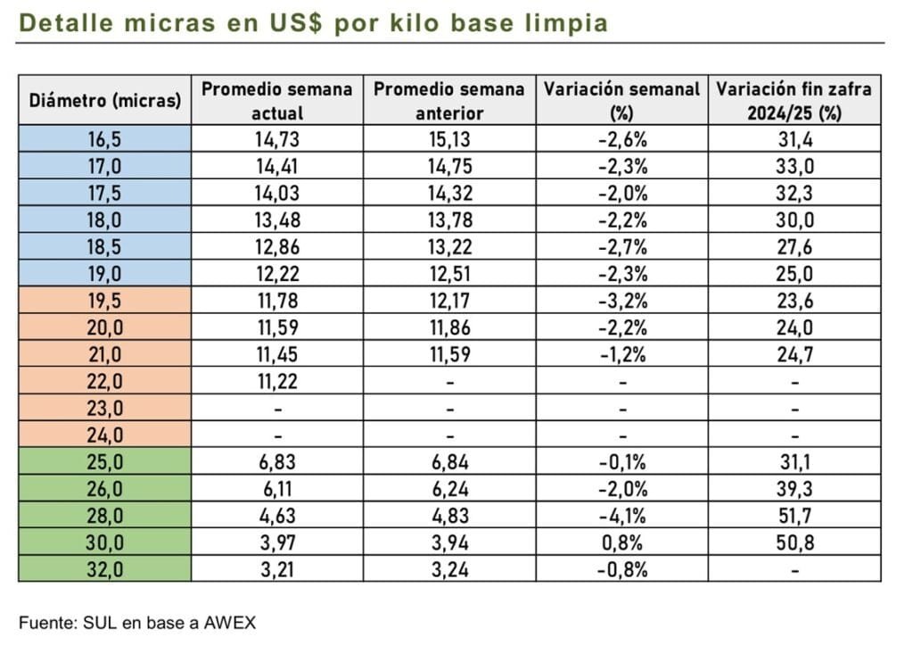 Las bajas más fuertes se concentraron en los lotes de 17.0 micras y más finos, que venían de registrar las subas más marcadas en las dos semanas previas. El percentil del precio guía (MPG) a 5 años para el diámetros de 17.0 micras ha subido a 63, luego de haberse ubicado en niveles tan bajos como 40–50 en tiempos recientes. En cambio, los precios de las lanas de 19.0 a 30.0 micras siguen siendo los más altos en cinco años, manteniéndose en el percentil 100.