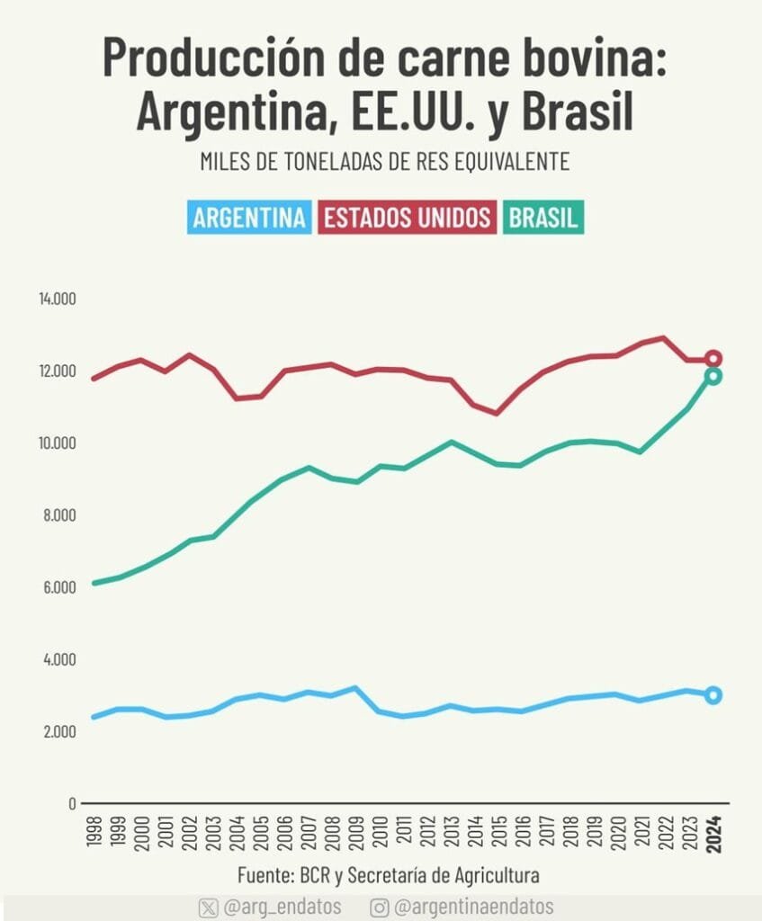 En ese mismo período, Brasil pasó de representar el 50% de la producción estadounidense, a producir prácticamente lo mismo en 2024, tal como se puede observar en la gráfica de Argentina Datos en base a información de la Bolsa de Comercio de Rosario y la Secretaría de Agricultura.