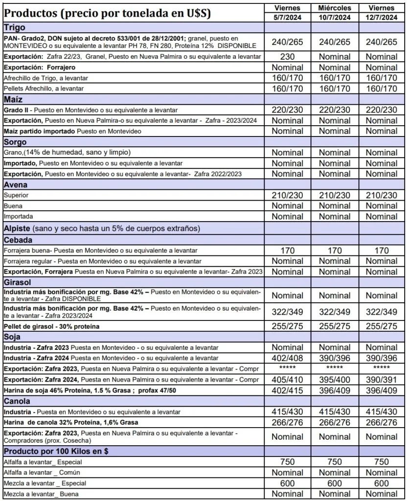 Montevideo | Todo El Campo | Los precios de los productos agrícolas informados por la Cámara Mercantil del Uruguay son los siguientes, actualizados al viernes 12 de julio.