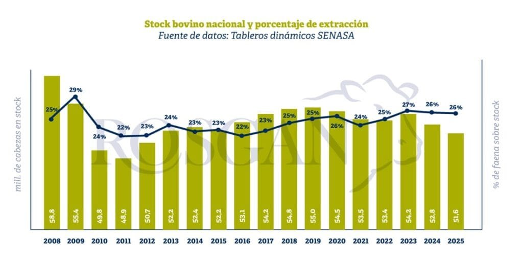 Considerando un stock inicial de 51,6 millones de cabezas, la tasa de extracción se ubicó por encima del 26%. Si bien este indicador muestra una leve caída frente a los dos últimos ciclos, permanece en niveles cercanos a los umbrales de equilibrio.