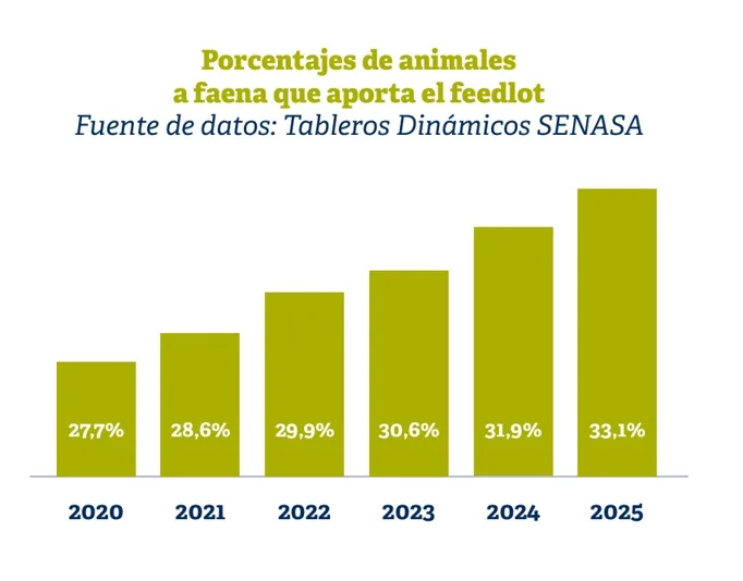 Al mismo tiempo, los feedlots muestran una participación creciente y sostenida en la oferta de animales destinados a faena. En 2025, el aporte de los corrales explicó el 33% de la faena total, frente al 32% en 2024 y al 30,6% en 2023.
