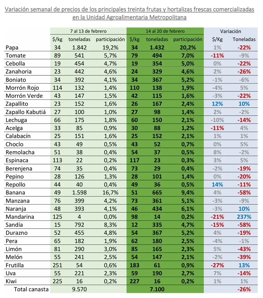 En zanahoria, el inicio de la semana mostró una leve suba de precios para las partidas de mejor calidad comercial. Sin embargo, hacia el resto de la semana, el menor dinamismo comercial asociado al período de carnaval impidió que esta tendencia se consolidara, retornando a un escenario relativamente estable.