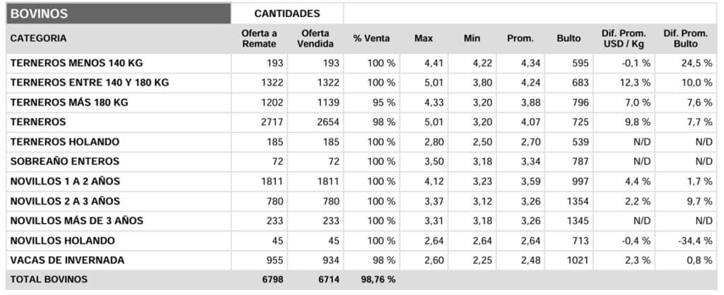 Terneros entre 140 y 180 kilos se comercializaron 1.322 animales (100% de la oferta) a un valor máximo de US$ 5,01, mínimo US$ 3,80 y promedio US$ 4,24 (diferencia de +12,3% respecto al remate anterior), y el promedio bulto fue de US$ 683 (+10%).