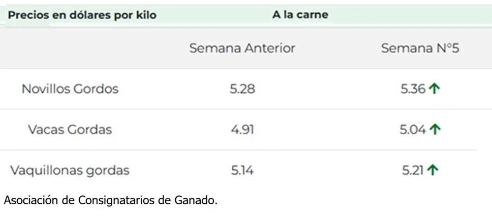 A la carne, el salto fue de US$ 5,14/kg a US$ 5,22/kg. Variación: +0,08 US$/kg.