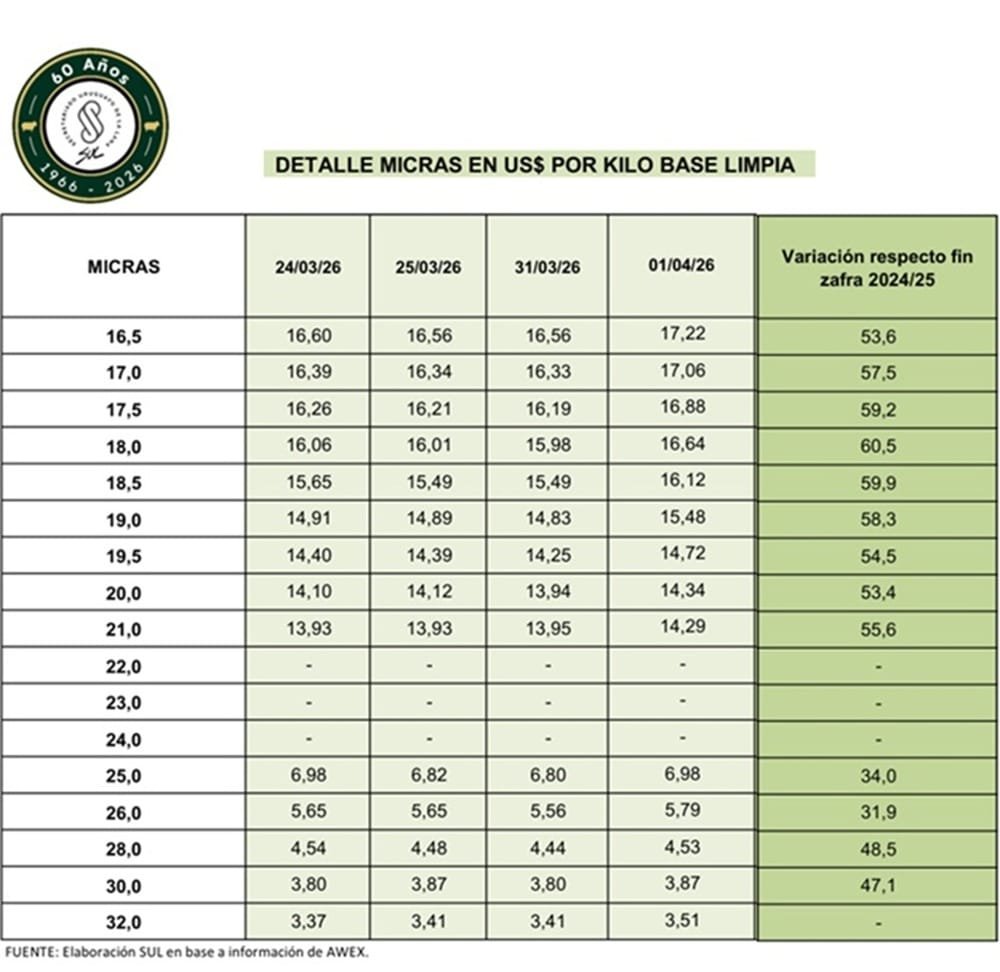 El informe del Secretariado Uruguayo de la Lana (SUL) detalló sobre esa jornada que “el mercado de vellón Merino mostró una clara tendencia alcista, con subas generalizadas en moneda australiana. Las lanas más finas fueron las más favorecidas, destacándose especialmente las de 17,5 a 19 micras, que registraron los mayores incrementos en moneda local” (dólar australiano).