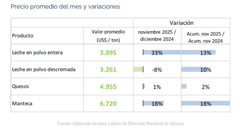 En 2025 se exportaron 152.042 toneladas de leche en polvo entera (total 6% superior a igual período de 2024), por US$ 607,9 millones (+20%).