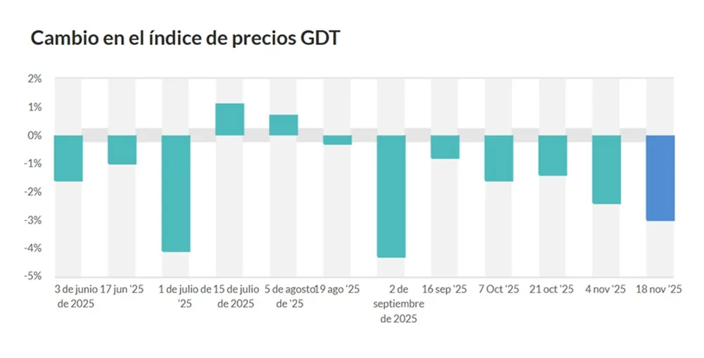 La leche en polvo bajó 1,9% hasta los US$ 3.452. Es la sexta caída consecutiva llegando al piso más bajo desde setiembre de 2024.