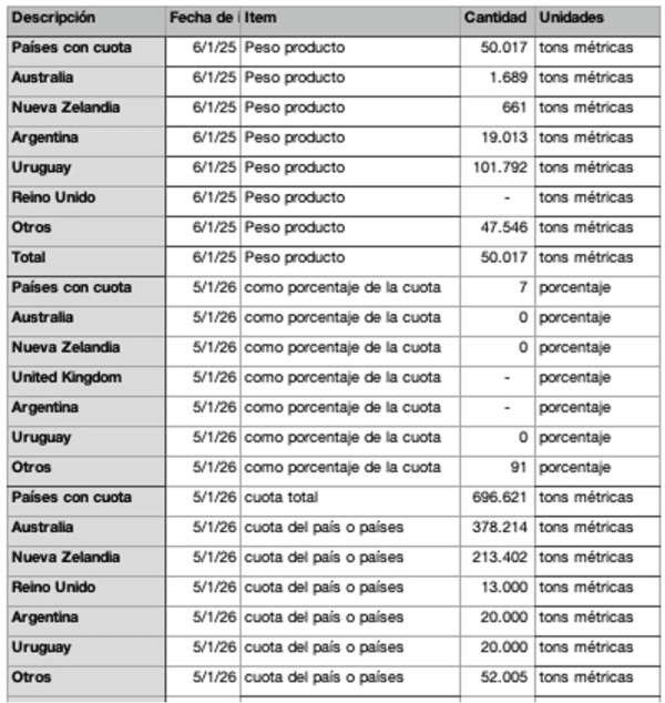 Además, aquella cuota era de 65 mil t por año hasta el año pasado, cuando EE.UU. transfirió 13 mil t de las mismas para el Reino Unido, en el primer acuerdo comercial logrado por EE.UU. tras el nefasto Día de la Liberación.