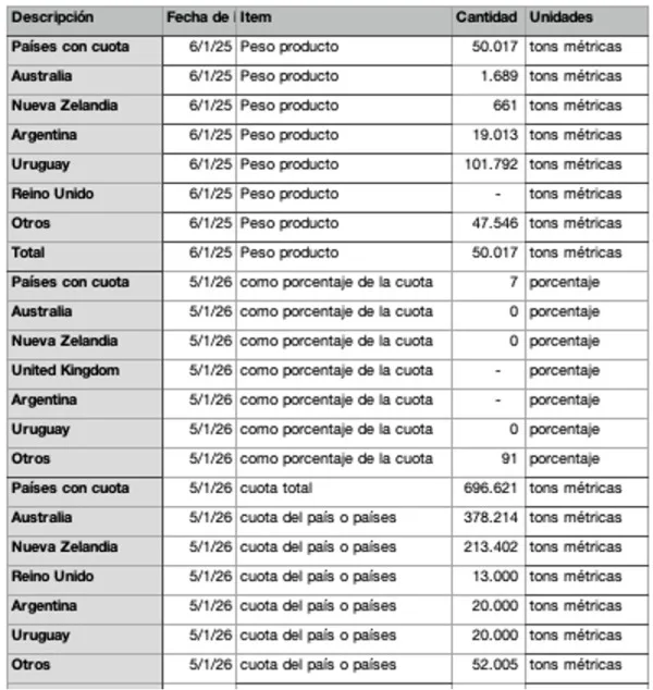 Además, aquella cuota era de 65 mil t por año hasta el año pasado, cuando EE.UU. transfirió 13 mil t de las mismas para el Reino Unido, en el primer acuerdo comercial logrado por EE.UU. tras el nefasto Día de la Liberación.