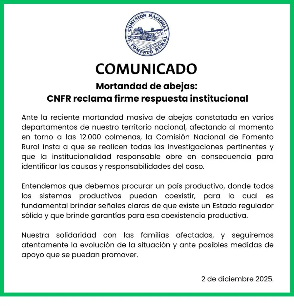 El comunicado difundido por el Ministerio de Ganadería, Agricultura y Pesca (MGAP) informa sobre los graves episodios de mortandad de abejas registrados en distintas zonas del país durante noviembre.