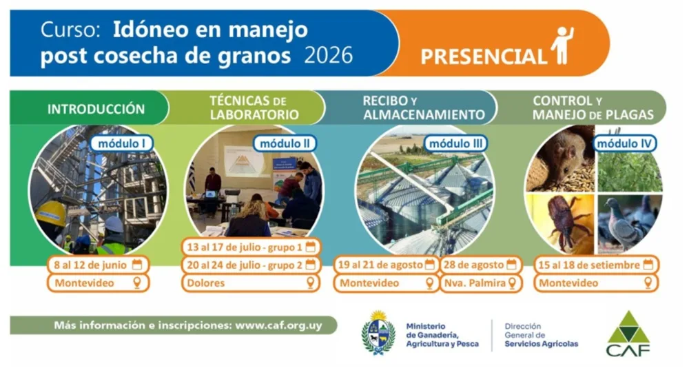 El curso se denomina Curso Idóneo en Manejo Post Cosecha de Granos 2026 y para él es que CAF y el MIEM están convocando. Las inscripciones comenzarán el lunes 4 de mayo.