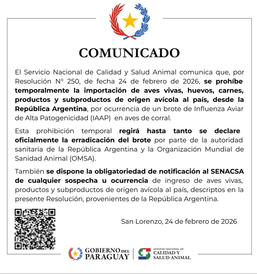 En Paraguay, el Servicio de Calidad y Salud Animal resolvió ayer “prohibir temporalmente la importación de aves vivas, huevos, carnes, productos y subproductos de origen avícola” desde Argentina.