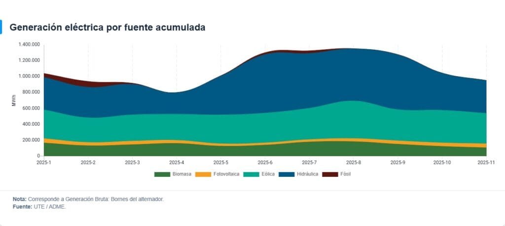En tanto, la producción de energía eléctrica con base en fuentes fósiles fue de tan solo 2% en 2025. De esta manera, Uruguay tuvo una matriz de generación eléctrica 98% de origen renovable en el último año.