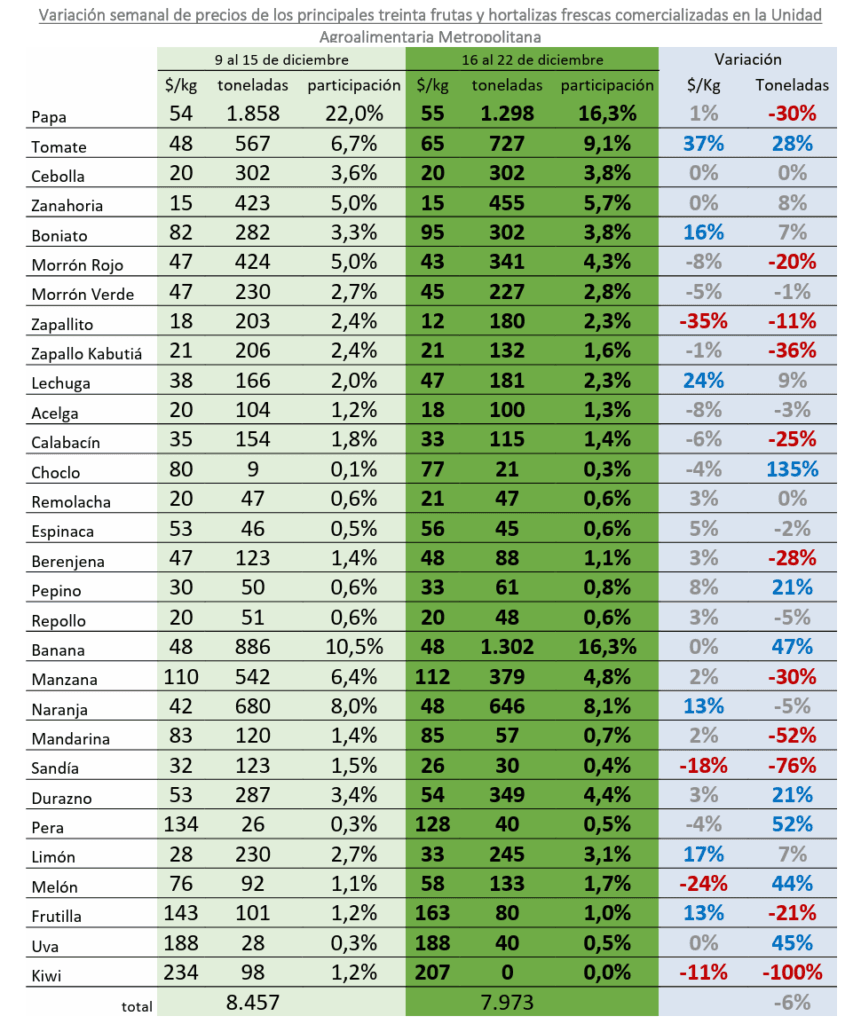 Son fechas que “generan un incremento en la compraventa mayorista, principalmente en rubros asociados al consumo de frutas y hortalizas de estación”, dice el boletín fechado el viernes 22 de diciembre.