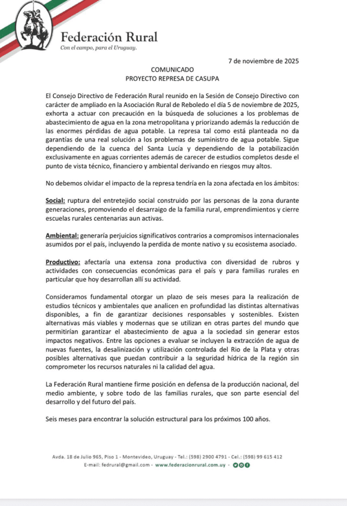 La institución considera que “tal como está planteada”, la represa de Casupá “no da garantías de una real solución a los problemas de suministro de agua potable” en cuanto continúa la dependencia de la cuenta del Santa Lucía y de la potabilización exclusivamente en Aguas Corrientes.
