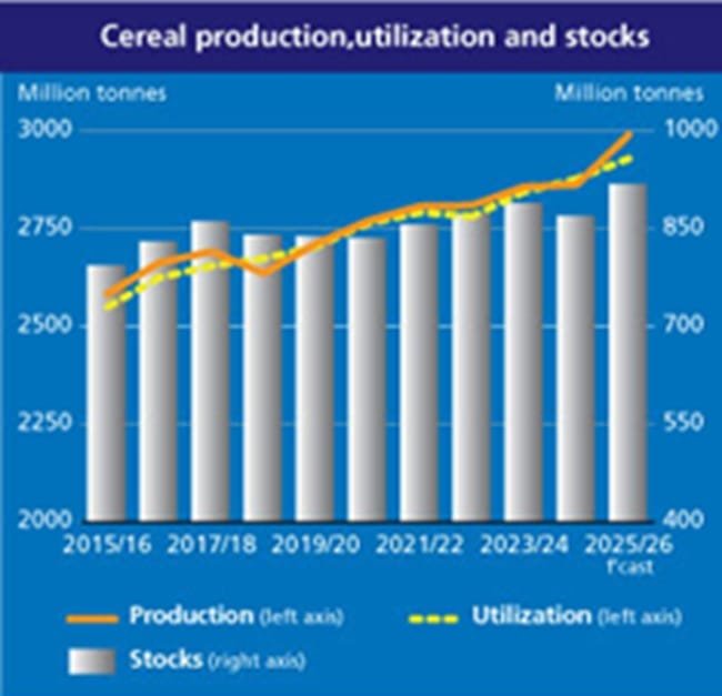Se prevé un aumento de la producción de todos los principales cereales, con el mayor aumento interanual pronosticado para el maíz y el menor para el arroz. Se prevé que tanto la producción de maíz como la de arroz alcancen nuevos máximos históricos.