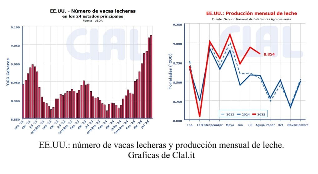 Mirco De Vincenzi | Italia | Clal | Todo El Campo | En los primeros siete meses de 2025, la producción de leche en los principales países exportadores aumentó alrededor de un 1%, con una aceleración del +2,6% solo en julio. La oferta, por lo tanto, se está expandiendo, mientras que la demanda no sigue el ritmo: el consumo mundial muestra una caída de alrededor de 600.000 toneladas en equivalente de leche.
