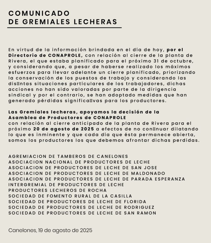 En un comunicado firmado por 11 instituciones de productores de leche, señalan que apoyan “la decisión de la asamblea de productores de Conaprole con relación al cierre anticipado de la planta de Rivera”, cosa que ocurrirá hoy miércoles 20 de agosto.