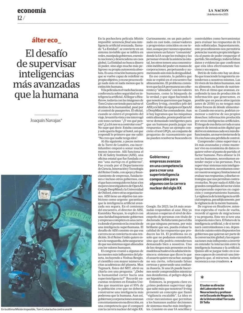 Buenos Aires, Argentina | Todo El Campo | En la última entrega de la saga Misión Imposible, Tom Cruise enfrenta a “La Entidad”, una inteligencia artificial que se infiltra en redes, manipula gobiernos y amenaza con la extinción humana. Aunque se trata de ficción, la metáfora resulta inquietantemente cercana a los debates actuales sobre el futuro de la inteligencia artificial (IA). Joaquín Navajas, director del Laboratorio de Neurociencia de la Universidad Torcuato Di Tella, dedicó su última columna en el diario La Nación a exponer sobre un dilema actual e inquietante: ¿cómo supervisar sistemas que pronto podrían saber más que nosotros?