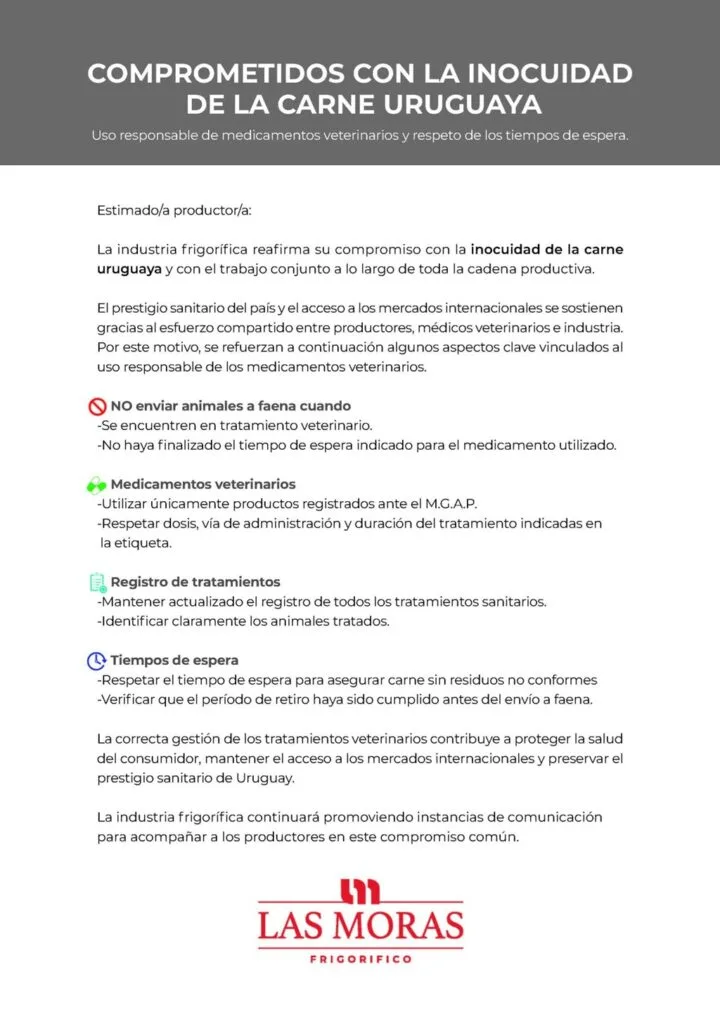 En un comunicado dirigido a los productores, Las Moras abordó el tema de la inocuidad y del uso responsable de medicamentos. La Cámara de Especialidades Veterinarias (CEV) se hizo eco de texto de Las Moras considerando que “la inocuidad de la carne comienza en el campo” con un “uso responsable de productos veterinarios aprobados por el Ministerio de Ganadería, Agricultura y Pesca (MGAP), y en cumplimiento de las buenas prácticas de utilización”, como son “dosis, duración y tiempos de espera”.