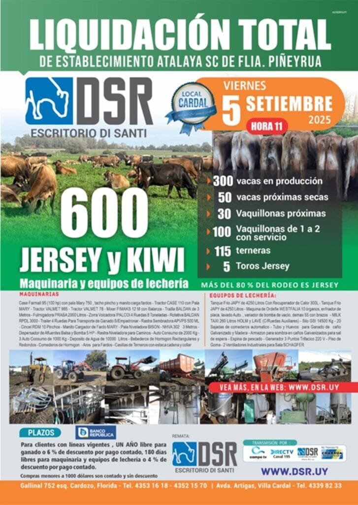 La oferta de hoy es de 600 Jersey y Kiwi, además de maquinaria y equipos de lechería, en una liquidación total del establecimiento Atalaya de la familia Piñeyrua.