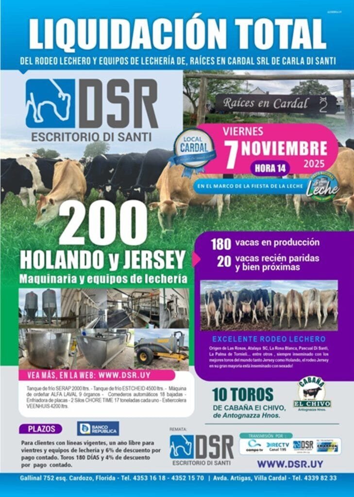 Se trata de la liquidación total del rodeo lechero y equipos de lechería del establecimiento Raíces en Cardal de Carla Di Santi.