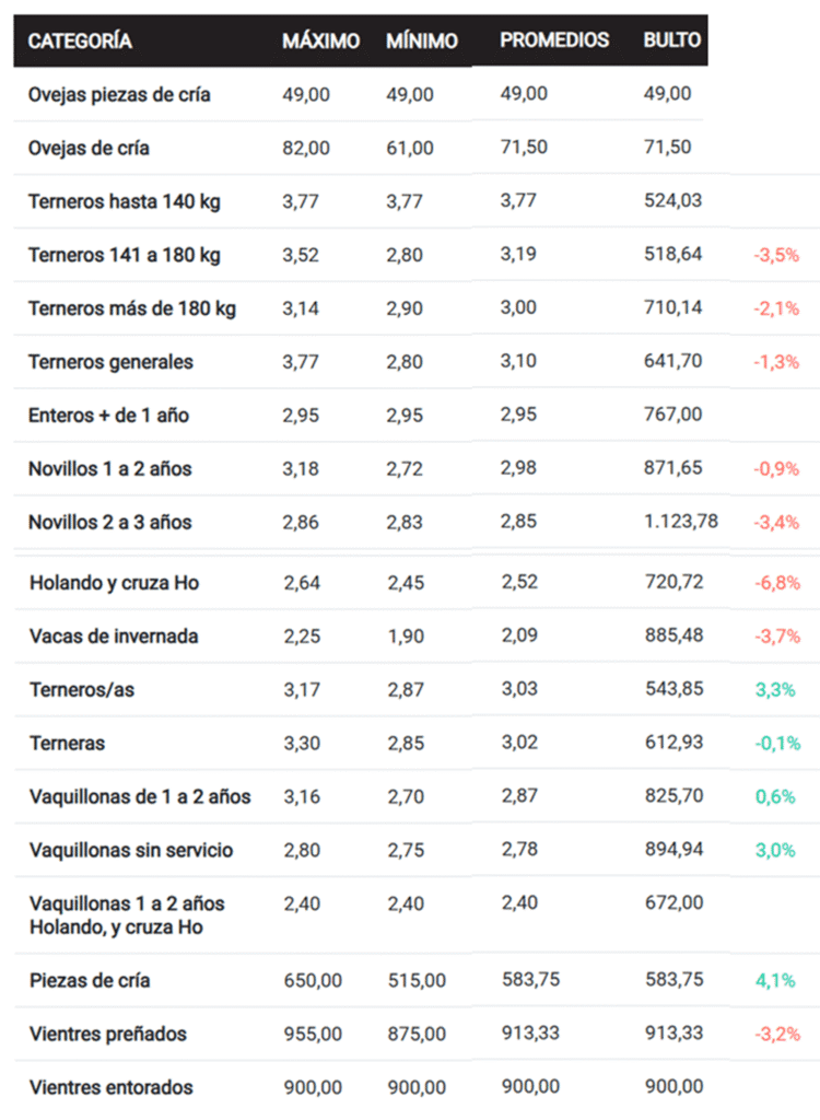 En esta ocasión tanto terneros como vacas de invernada casi que sostuvieron sus promedios. Terneras, vaquillonas y piezas de cría, sí mostraron algunos ajustes, aunque en un marco de agilidad. La escasa oferta de novillos estuvo bien paga. La fila de ganado carnudo y gordo acompañó el momento del mercado.