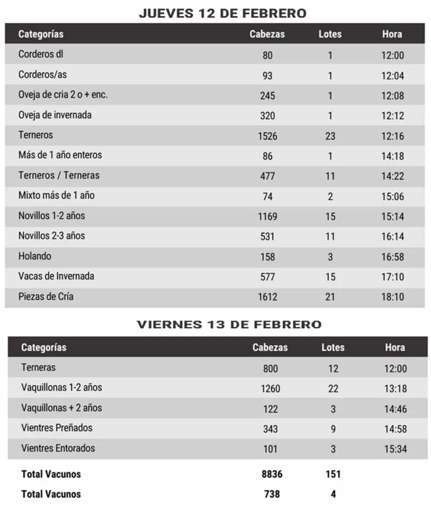 Oferta ajustada a la época anunció la firma: 200 vacunos en todas las categorías, entrando lotecitos de terneros, terneras, vaquillonas, vacas de invernada y piezas de cría, algo de ganado carnudo y gordo; 100 ovinos de consumo y campo; y completando la oferta más de 100 yeguarizos de andar y potros entrando mansos recomendados.