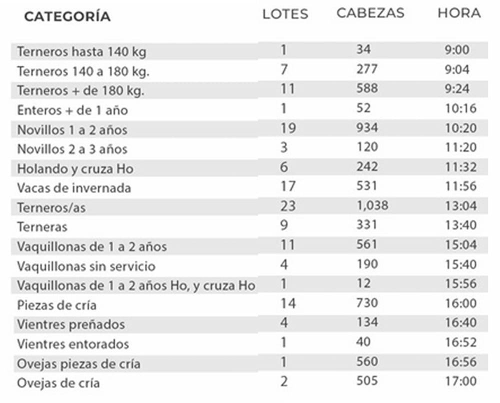 La oferta de Valle del Laurel fue de 36 toros de pedigrí Polled Hereford de 2 a 3 años entrando algunos planteleros; de Los Macachines se ofertaron 12 Aberdeen y Red Angus de 2 y hasta 3 años; y de cabaña Pinduca, 9 Aberdeen y Red Angus de 2 y hasta 3 años.