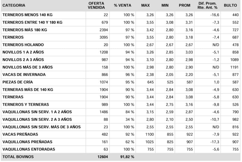 22 terneros menos 140 kg, 100% de venta, valor único US$ 3,26, bulto US$ 440 (diferencia con el remate anterior -16,6%).