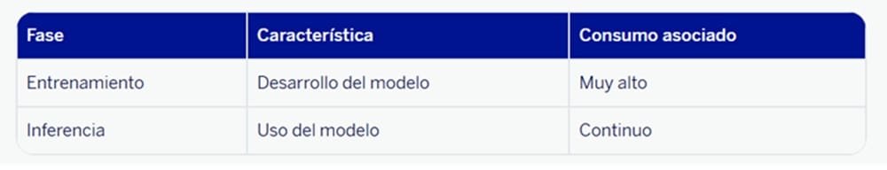 ¿QUÉ FASES DE LA IA CONSUMEN MÁS AGUA? Respuesta: El entrenamiento de modelos consume grandes recursos inicialmente, mientras que la inferencia genera un consumo constante con cada uso.