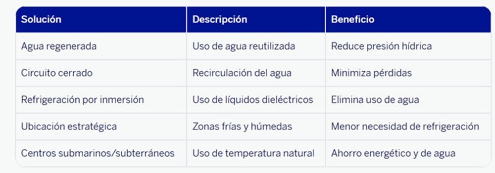 • Optar por sistemas de refrigeración sin agua que pueden mejorar la eficiencia en el uso de recursos naturales. Frederic Clarens, director de la unidad tecnológica de Residuos, Energía e Impacto Ambiental de Eurecat, asegura que hay una “alternativa prometedora” como la refrigeración por inmersión: los servidores pueden sumergirse en líquidos dieléctricos que absorben el calor de forma mucho más eficiente que el aire. Esta tecnología permite atacar una de las principales causas del consumo hídrico: la necesidad de refrigeración intensiva. Esta solución permite reducir drásticamente, e incluso eliminar, el uso de agua en la refrigeración, según análisis del sector como los publicados por Data Center Frontier.