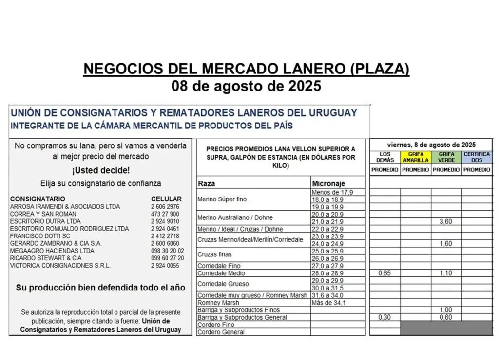 Aunque el receso en Australia se extiende hasta la próxima semana, en Uruguay el SUL publicó datos sobre el mercado local, concretamente para lotes Merino, Merino Dohne, Corriedale y cruza.