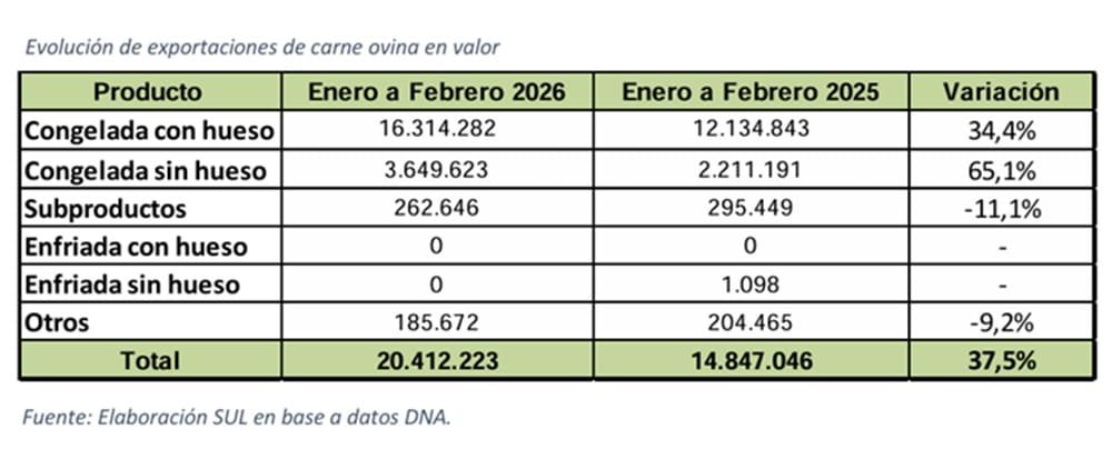 Montevideo | Todo El Campo | En términos de valor, durante el primer bimestre de 2026 ingresaron al país por exportaciones de carne ovina US$ 20.412.223, total que representa un 37,5% más que en el mismo periodo de 2025, informó el Secretariado Uruguayo de la Lana (SUL).