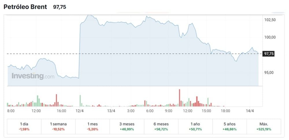 Al redactar el presente artículo el valor del barril se colocó en 97,75 US$/barril, sin embargo el informe de Investing.com indica que el lunes 13 cerró la jornada en 97,86 US$/barril, con una caída diaria de -1,51% respecto al cierre anterior (99,36 US$). El rango intradía se ubicó entre 96,48 y 98,68 US$, mientras que en la comparación semanal el retroceso fue más marcado: -10,42%.