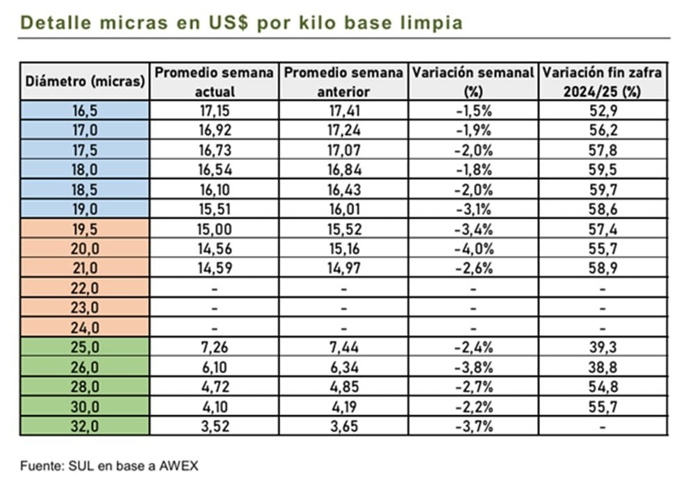 Selectividad: Aunque la debilidad afectó a todos los diámetros (especialmente lanas Merino medias, finas y Cruza), se mantuvo la demanda y preferencia por lotes de alta calidad y con buenos datos objetivos.