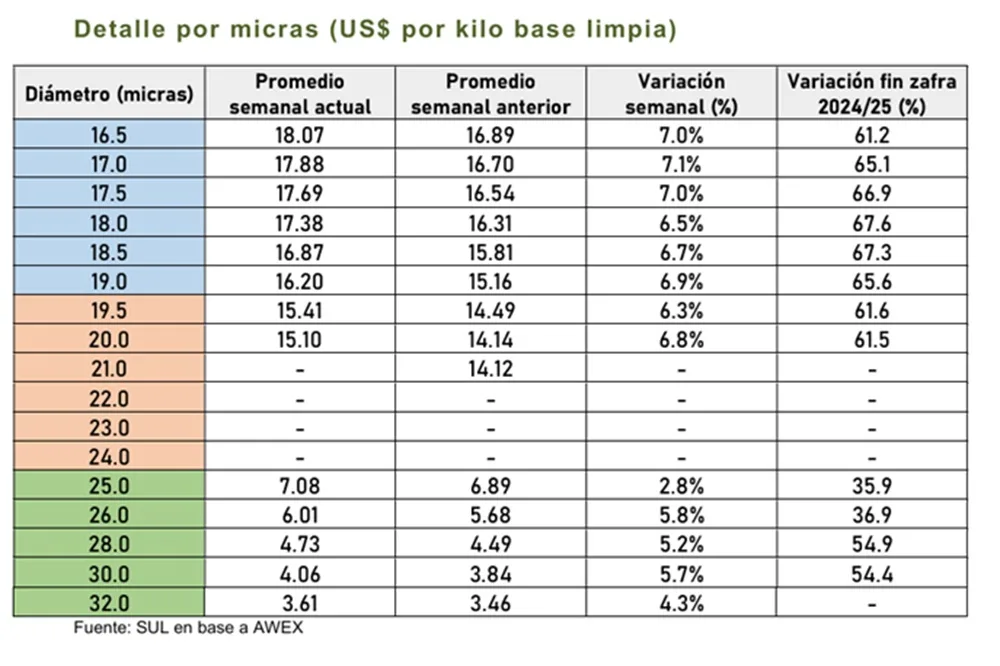 Montevideo | Todo El Campo | El informe semanal del mercado lanero (17/04/2026) del Secretariado Uruguayo de la Lana (SUL), mostró un mercado internacional con ajustes a la baja en varias categorías, especialmente en lanas finas, aunque el promedio del Indicador del Mercado del Este (IME) subió 68 centavos en dólares estadounidenses y cerró la semana a US$ 13,02.