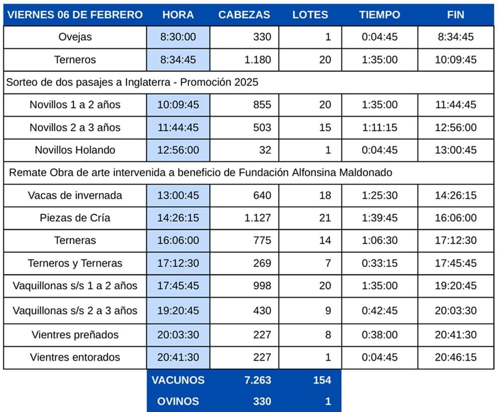 La oferta es de 7.263 vacunos y 330 ovinos; las ventas comenzarán a las 08.30 horas, con transmisión por los canales habituales, pudiéndose seguir las ventas desde la web de Todo El Campo.