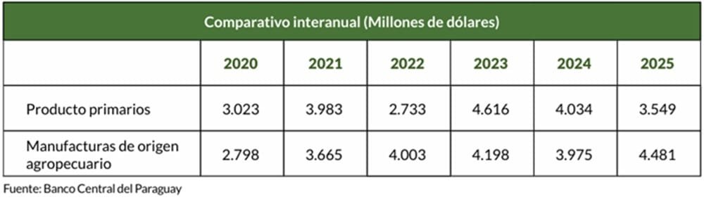 Entre 2020 y 2025 las exportaciones paraguayas exhibieron una alternancia en el liderazgo entre productos primarios y MOA.