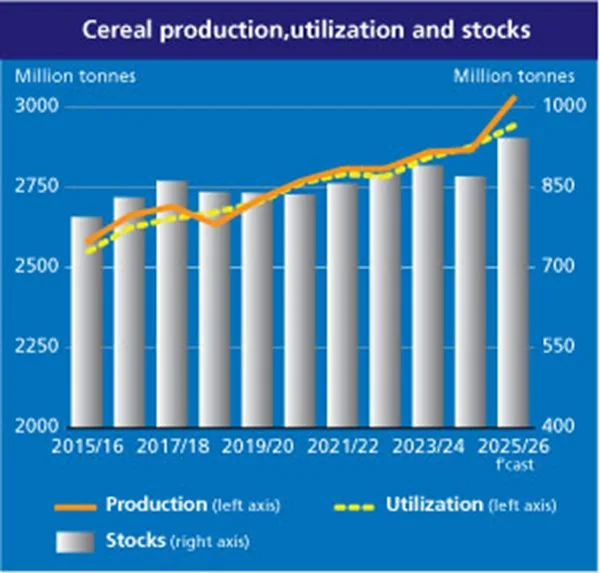 El informe de la FAO también revisó al alza su estimación para la producción mundial de cereales de 2025 hasta un récord de 3.029 millones de toneladas (gráfico interior), un aumento del 5,6% respecto al año anterior.