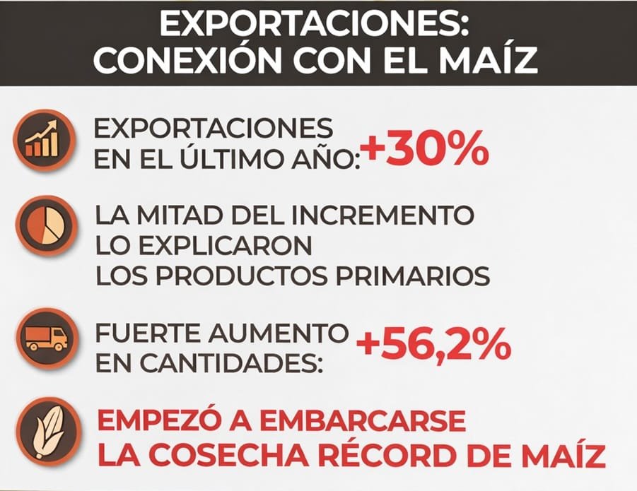 Esta semana se dieron a conocer datos comerciales a marzo, mostrando que en el último año las exportaciones totales crecieron 30%; más de la mitad de ese crecimiento viene por la colocación en el exterior de productor primarios, sobre todo por los envíos de maíz.